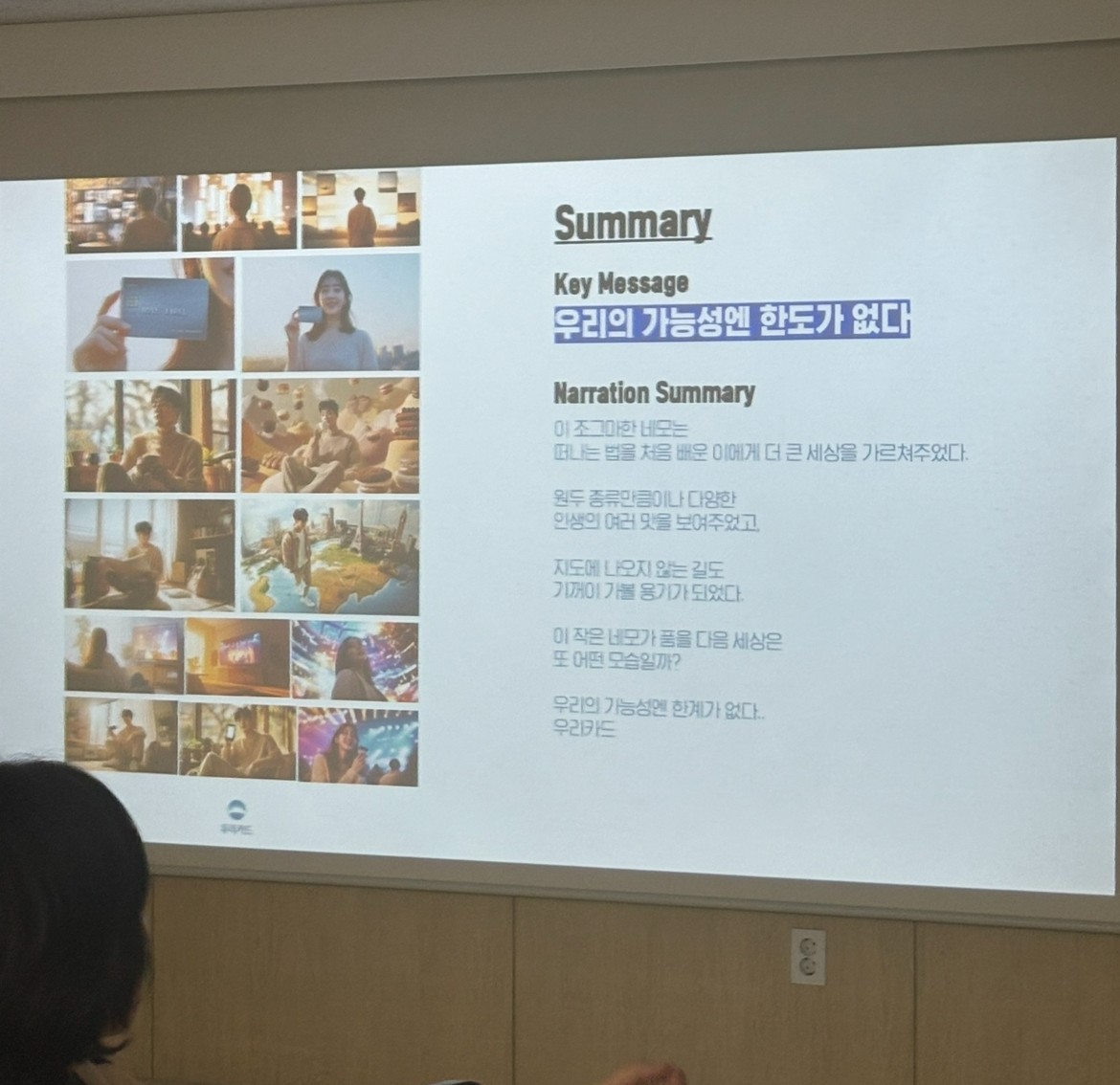 이와 함께 국내외 시장의 AI 활용 차이를 짚어주신 것도 깊은 인상 깊었는데, 국내에서는 주로 한 번도 보지 못한 신선한 결과물을 얻는 데 초점을 두는 반면, 해외에서는 브랜드 정체성 강화나 CSR 캠페인과 같은 전략적 활용에 더 무게를 두고 있었다. 이 비교를 통해 AI가 단순히 새로운 이미지를 만들어내는 수준을 넘어, 브랜드 가치와 사회적 메시지를 확장하는 전략적 파트너가 될 수 있다는 점을 이해할 수 있었다. 특히 우리가 일상에서 무심코 던지는 말이나 아이디어조차 AI를 통해 곧바로 시각적 결과물로 구현된다는 설명은 광고 기획자의 역할이 앞으로 얼마나 민첩하고 통찰력 있게 변해야 하는지를 잘 보여주었다.